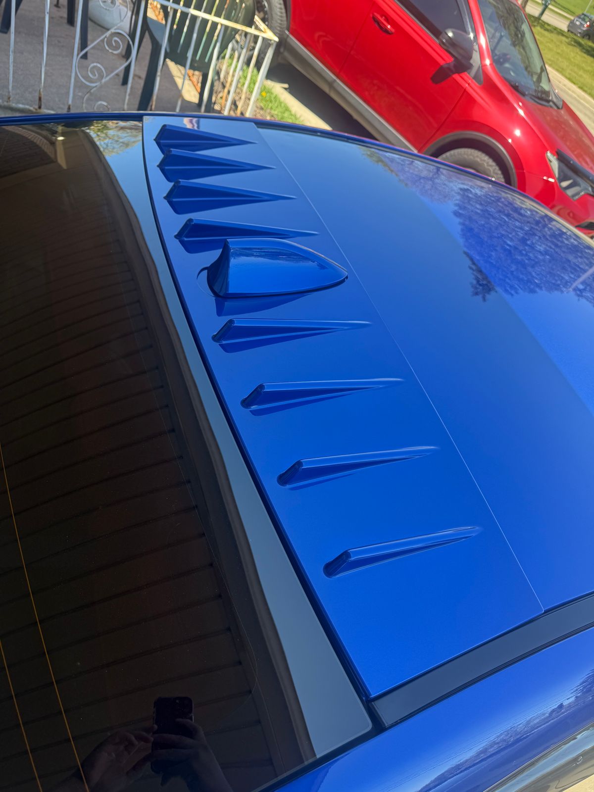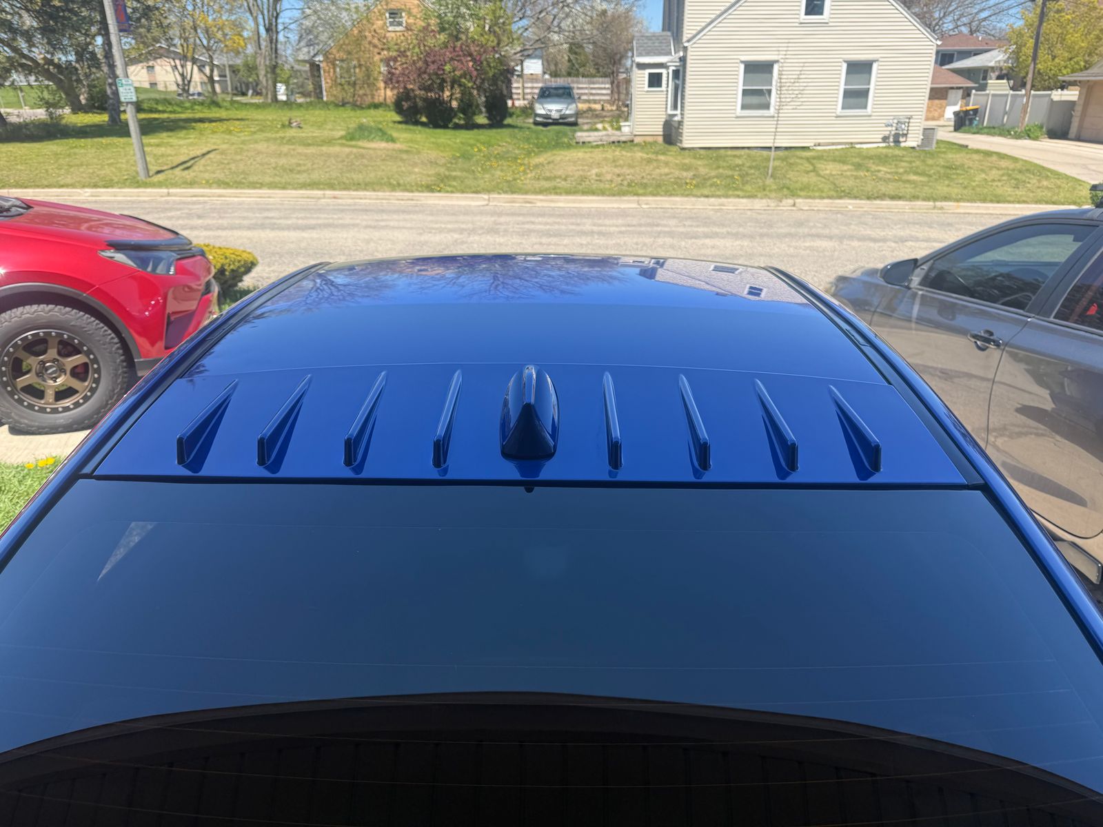 This new vortex generator is larger than the OEM model in all dimensions. It fully extends to the rain gutters and surrounds the factory antenna.