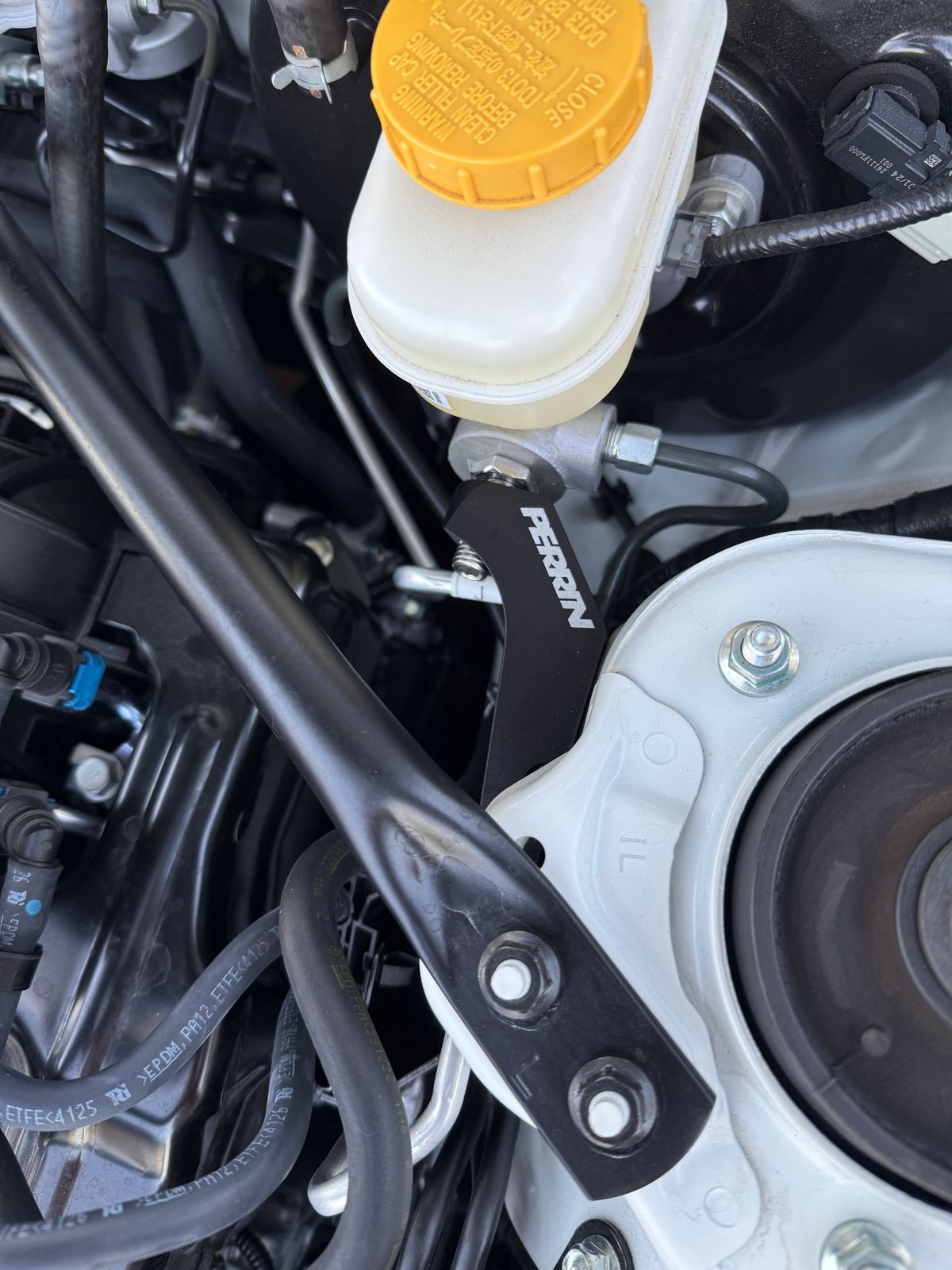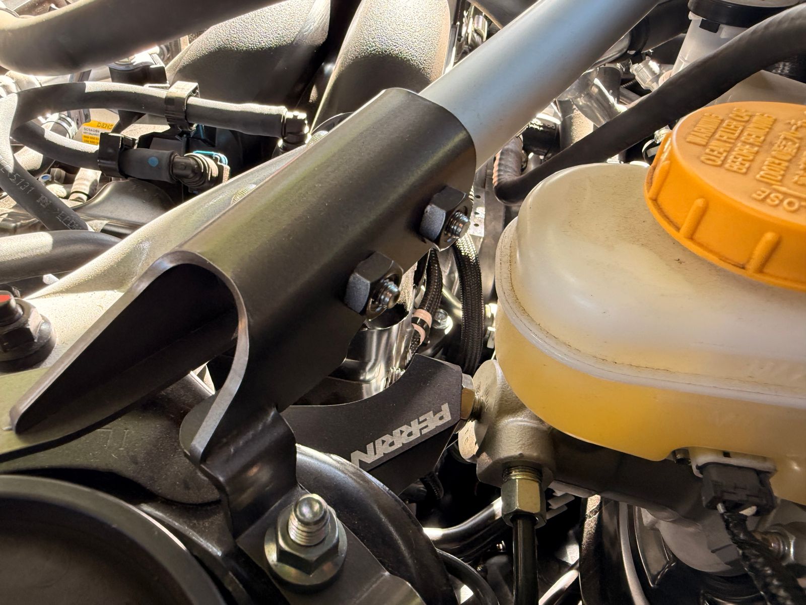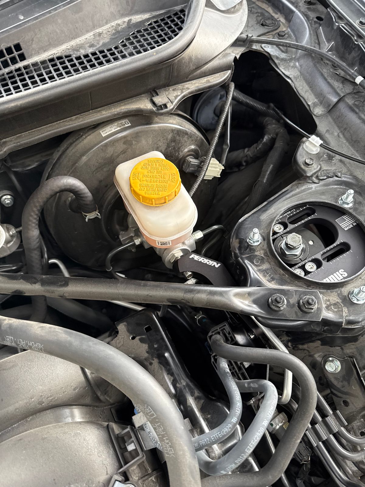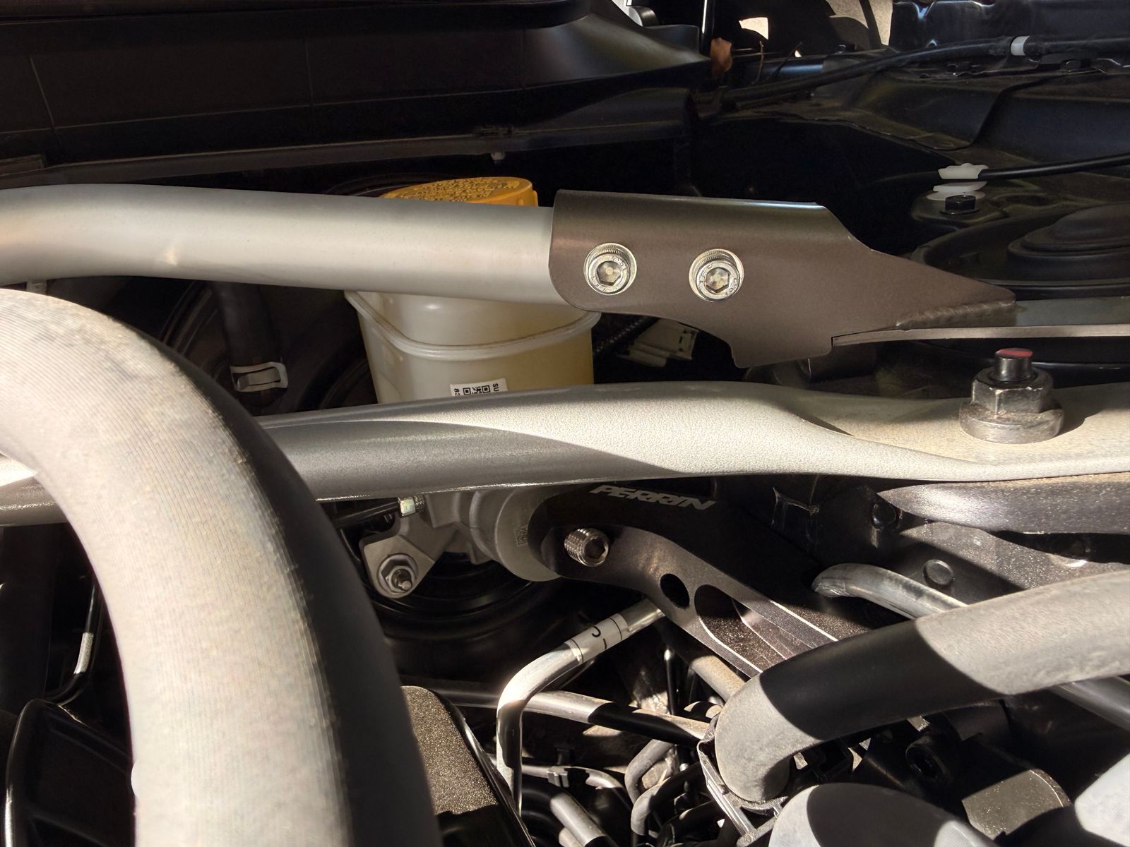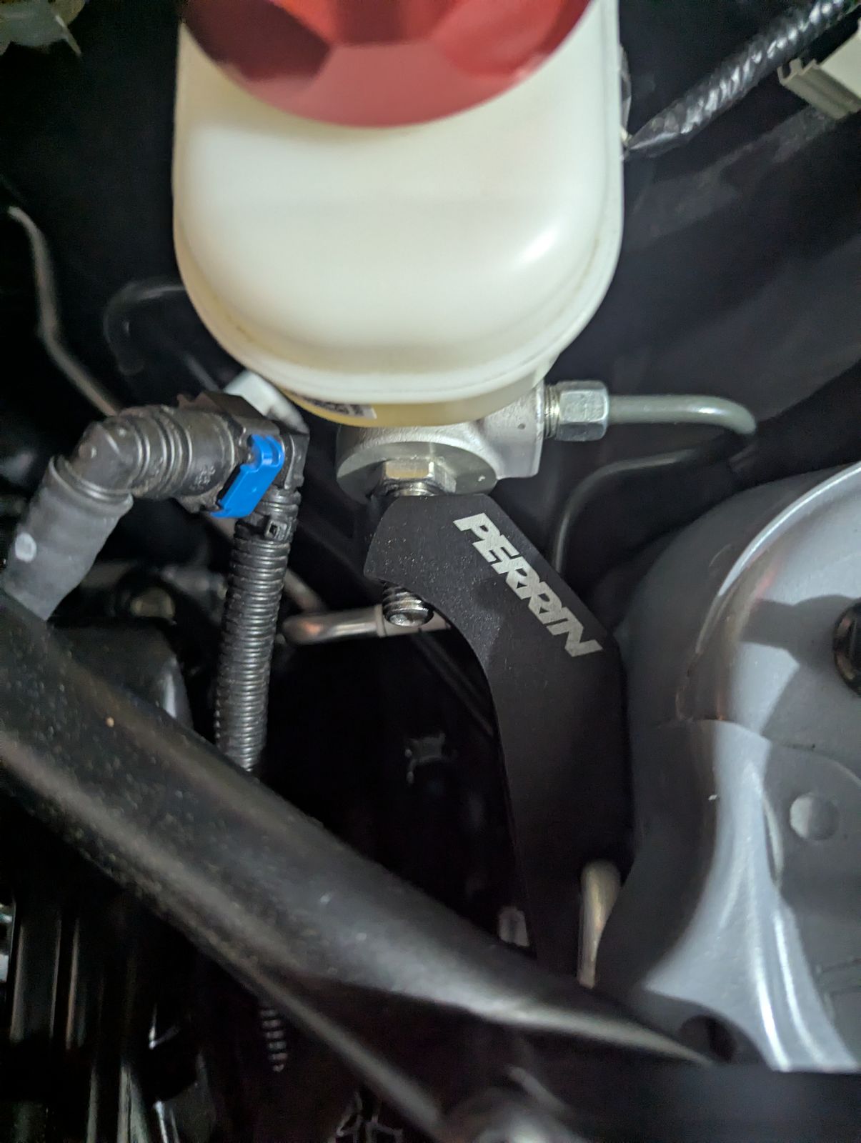 The Perrin master cylinder support brace provides the much needed support for the master cylinder and brake booster that the stock setup just can't provide. When you place force against the pedal the brake booster and master cylinder actually bend away from the you. The sheet metal that these parts are bolted to just can't prevent movement and over time can fatigue to the point of failure. Perrin designers devised a simple plan to fix this problem- an easy to install and inexpensive brace cut from 6061 aluminum that bolts to the driver side shock tower. With the Perrin brace you are placing tension on the master cylinder opposite the brake pedal, completely eliminating this pendulum like motion. The firmed up pedal feel without any risk of damage to the fire wall makes this brace such a popular upgrade.