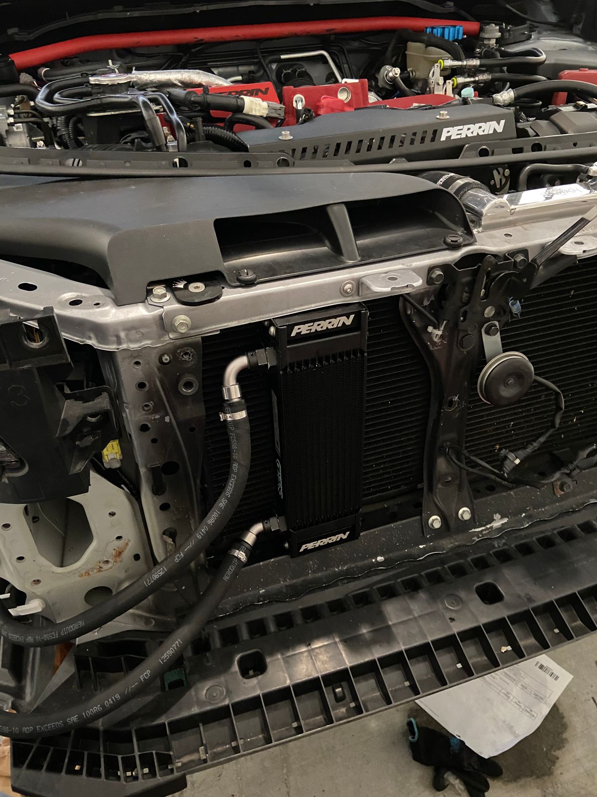 PERRIN's WRX oil cooler kit uses lightweight Aeroquip brand -10 hose that is rated for 250psi and 300°F continuous temperature. Each hose consists of anodized -10 push-lock type aluminum hose ends. These fittings are designed to fit without the need for clamps, but we take the extra step and add a clamp ensuring they will never come apart. Unlike other kits that make you assemble your hoses, PERRIN preassembles them for you!