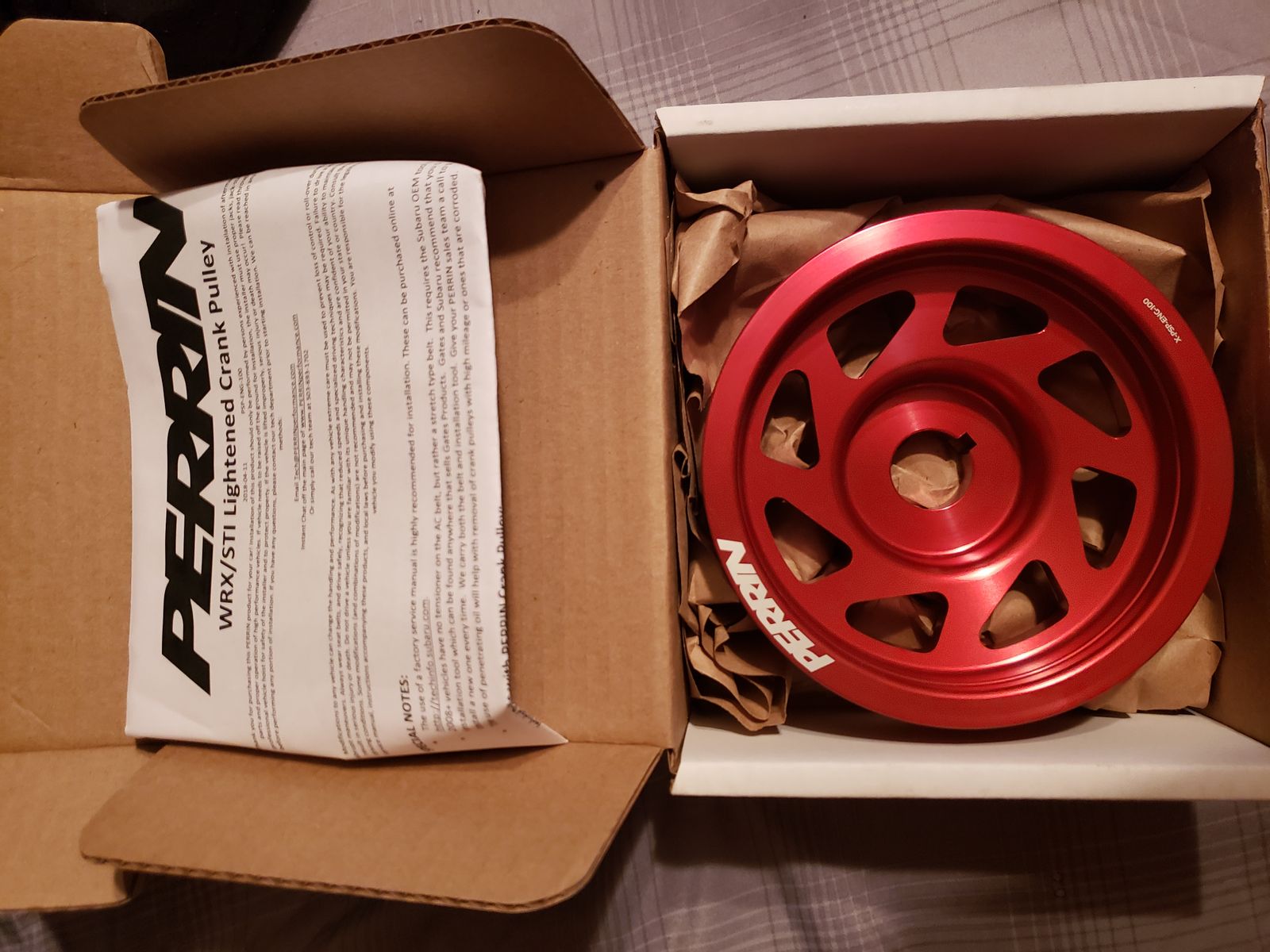 Perrin's lightened crank pulley for the Subaru WRX and STI is engineered to reduce rotating mass, increasing horsepower and torque. Made from 6061T6 aluminum and The Perrin lightweight crank pulley's weight is 1.2lbs, which makes the pulley more than 4lbs lighter then the stock crank pulley. This weight reduction from the crankshaft is equal to removing more than 100+lbs of vehicle weight. Perrin's pulley is not underdriven and will not affect the life of your engine. The pulley is simply a redesigned, lighter version of the stock crank pulley.